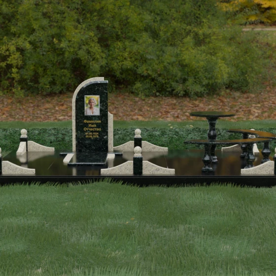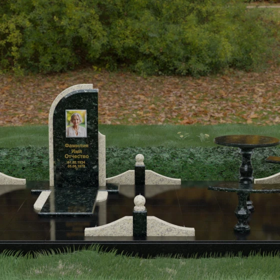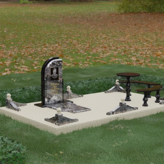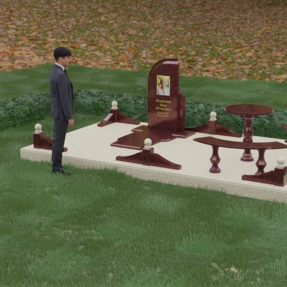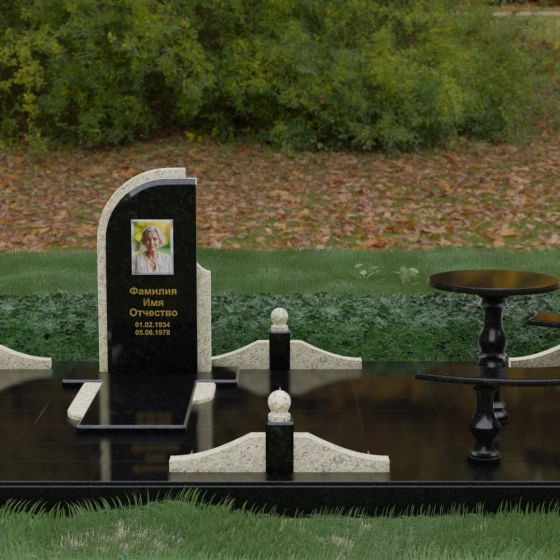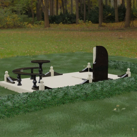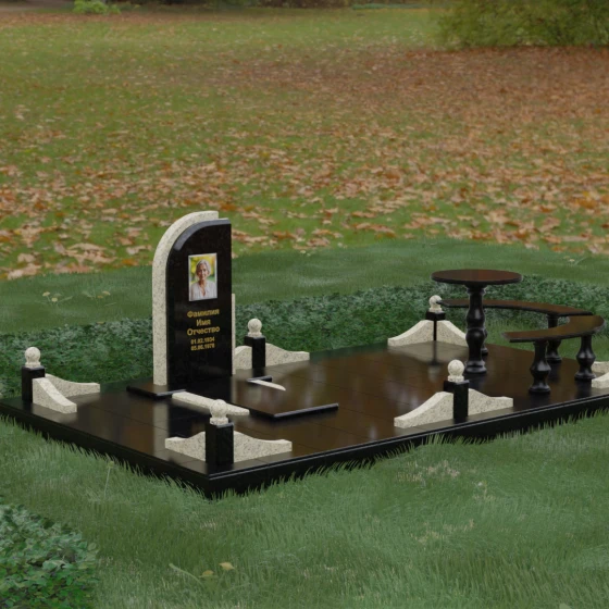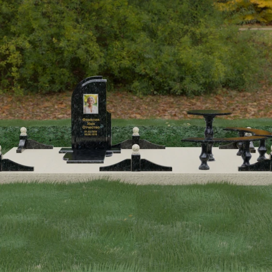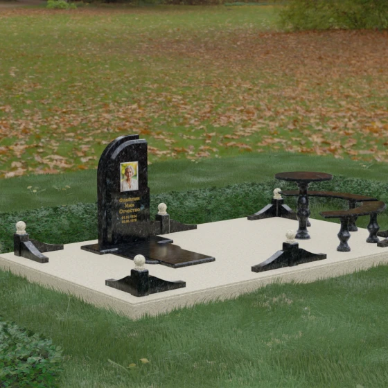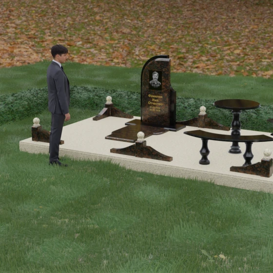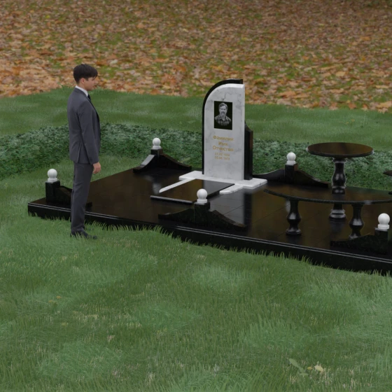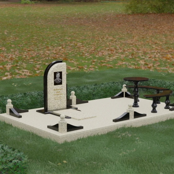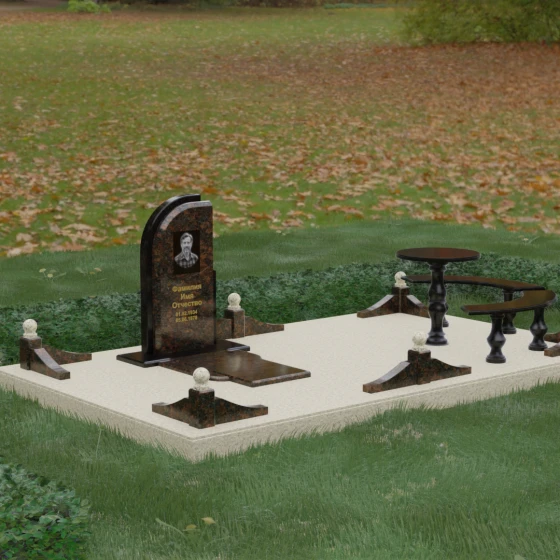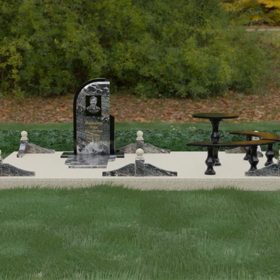 Благоустройство участка выполнено в стиле европейского мемориального дизайна, подразумевающем полное мощение площади полированными плитами. Это создает законченный, благородный вид и полностью исключает необходимость борьбы с сорняками. Периметр обозначен декоративным цоколем с оригинальными волнообразными вставками из светлого камня. Венцом ограждения служат массивные гранитные столбики, увенчанные идеально отполированными шарами — символами вечности и завершенности жизненного пути. В правую часть комплекса интегрирована зона поминовения: изящный круглый стол на фигурной балясине и полукруглая скамья, повторяющая плавные очертания общей архитектуры комплекса. Использование тех же сортов камня в мебели, что и в основной стеле, связывает все элементы в единую художественную канву.