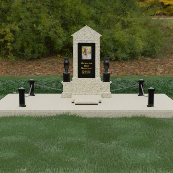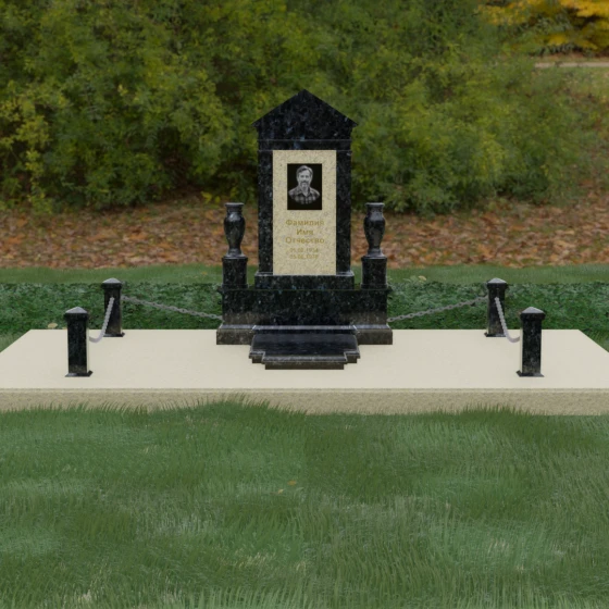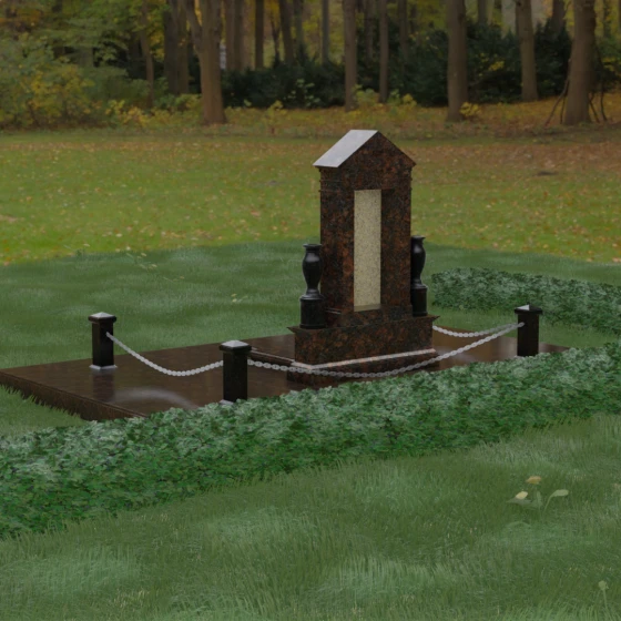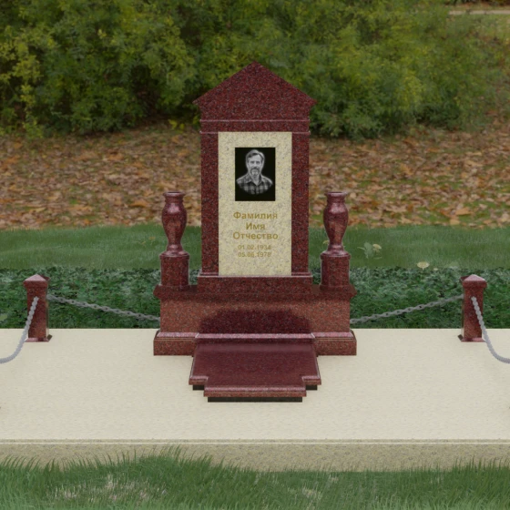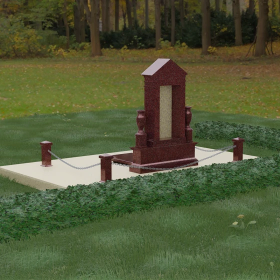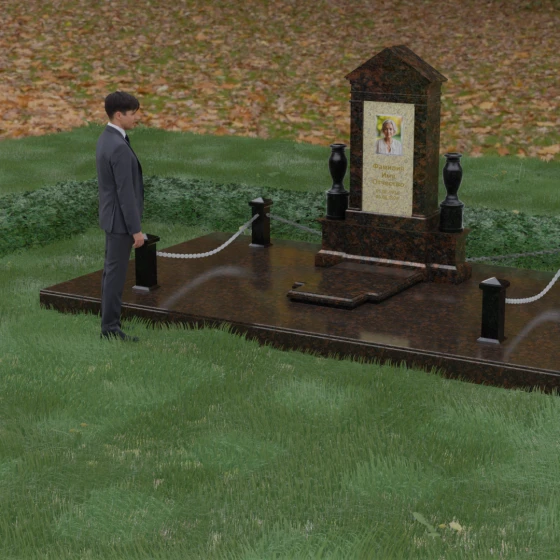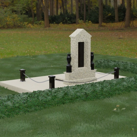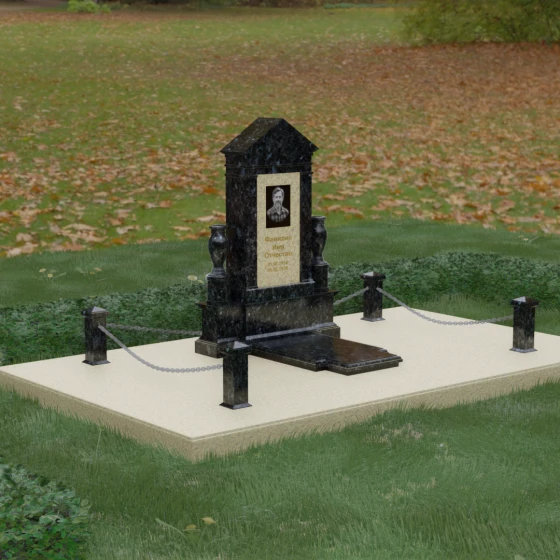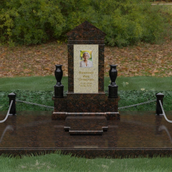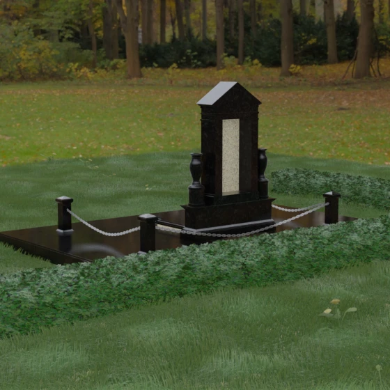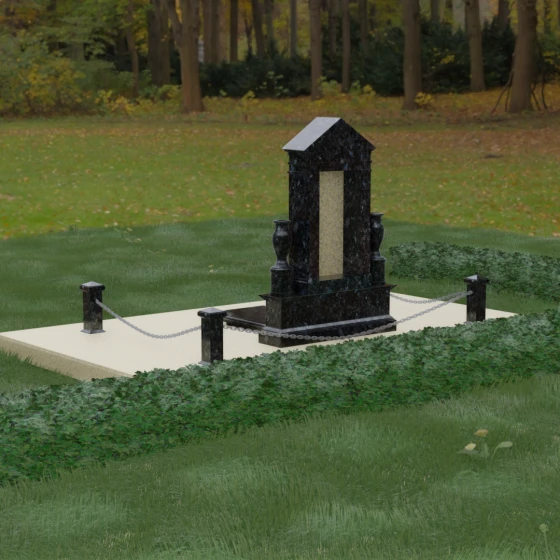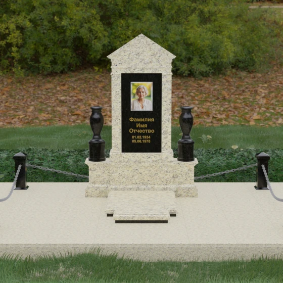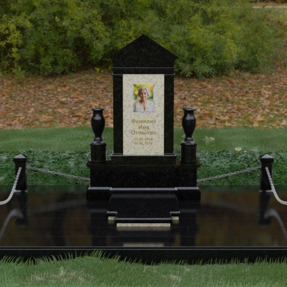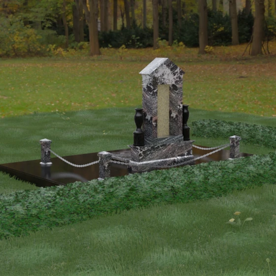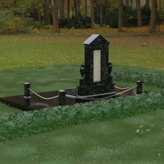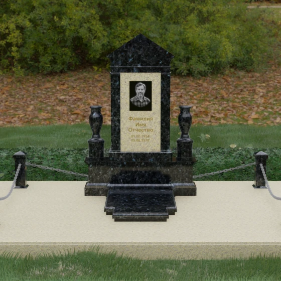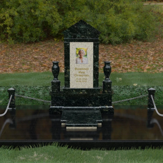 Данная мемориальная композиция представляет собой величественный архитектурный ансамбль, выполненный в лучших традициях монументального искусства. В центре художественного замысла находится вертикальная стела, чье навершие выполнено в форме классического фронтона, напоминающего очертания часовни или портала. Этот строгий, но в то же время одухотворенный силуэт символизирует «небесный дом» и покой. Изящная игра контрастов достигается за счет использования контрастной вставки в центральной части обелиска — светлая панель с благородной текстурой служит идеальным холстом для портрета и памятных надписей, выделяя их на фоне глубокого цвета основного массива камня. Плавные, безупречно отполированные грани стелы и мягкие изгибы декоративных ваз, фланкирующих монумент, олицетворяют гармонию и завершенность жизненного пути.