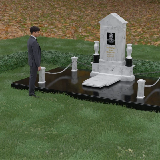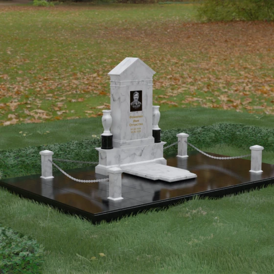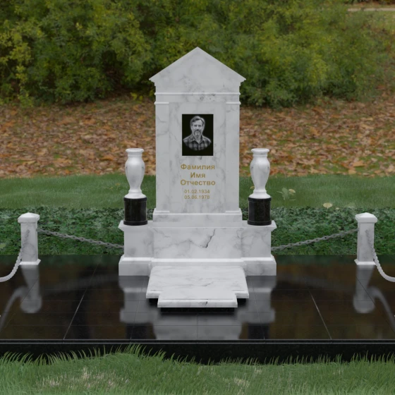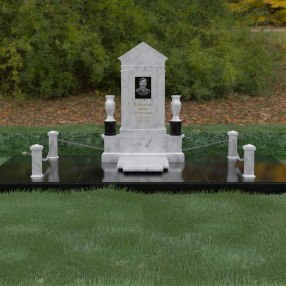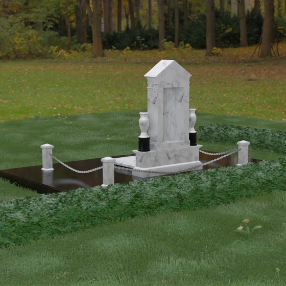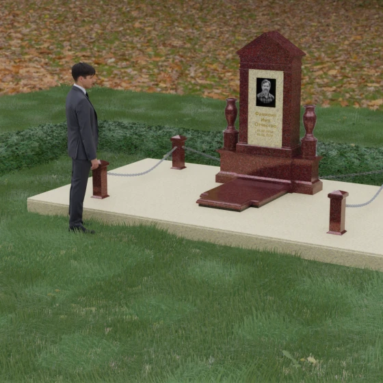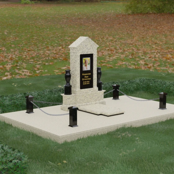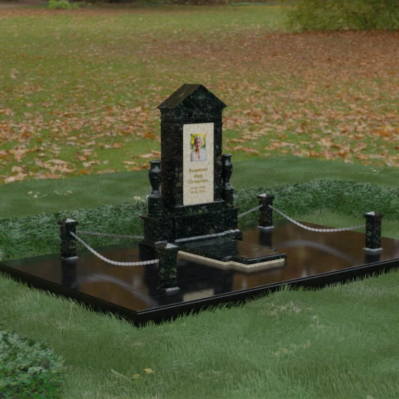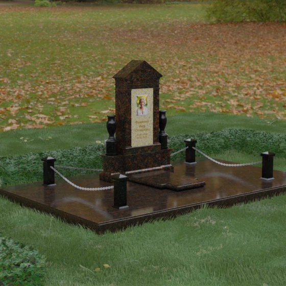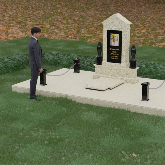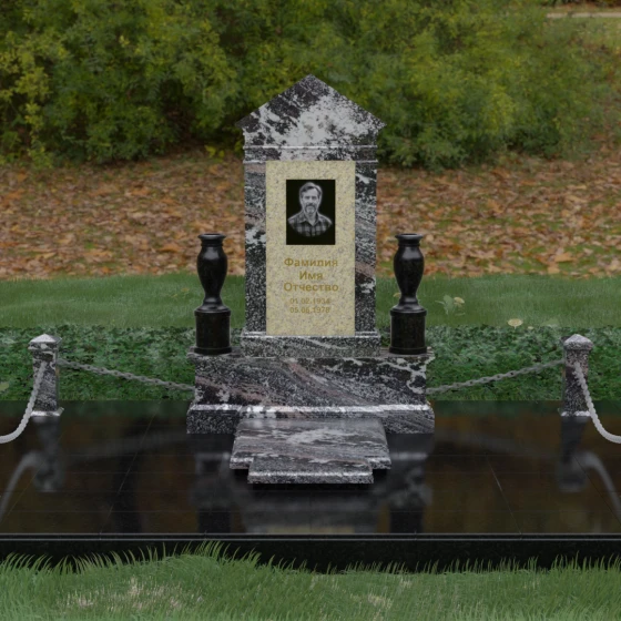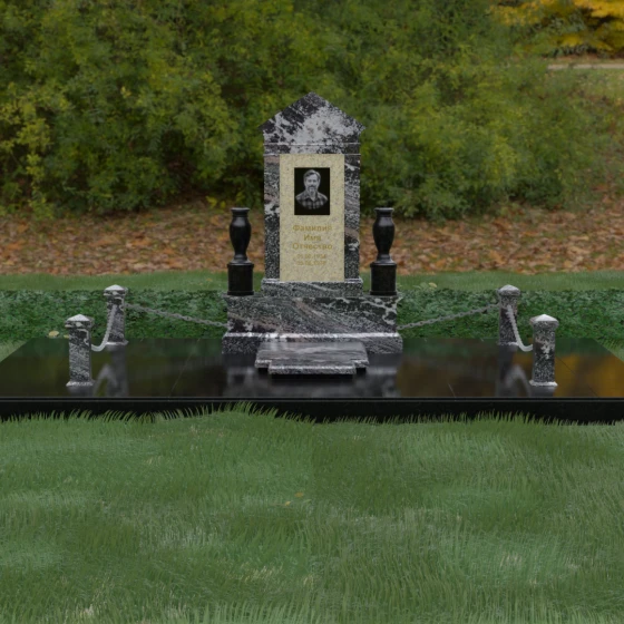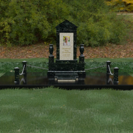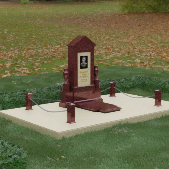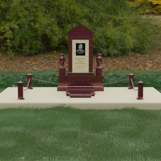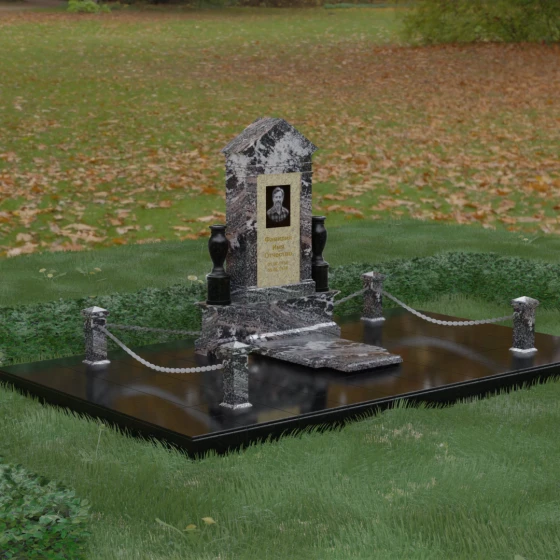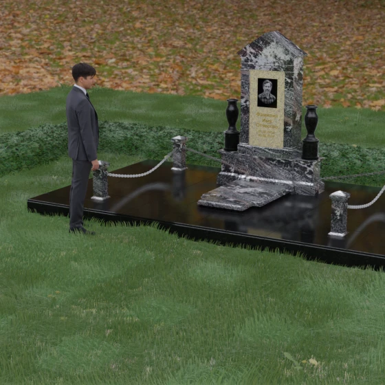 Данная мемориальная композиция представляет собой величественный архитектурный ансамбль, выполненный в лучших традициях монументального искусства. В центре художественного замысла находится вертикальная стела, чье навершие выполнено в форме классического фронтона, напоминающего очертания часовни или портала. Этот строгий, но в то же время одухотворенный силуэт символизирует «небесный дом» и покой. Изящная игра контрастов достигается за счет использования контрастной вставки в центральной части обелиска — светлая панель с благородной текстурой служит идеальным холстом для портрета и памятных надписей, выделяя их на фоне глубокого цвета основного массива камня. Плавные, безупречно отполированные грани стелы и мягкие изгибы декоративных ваз, фланкирующих монумент, олицетворяют гармонию и завершенность жизненного пути.