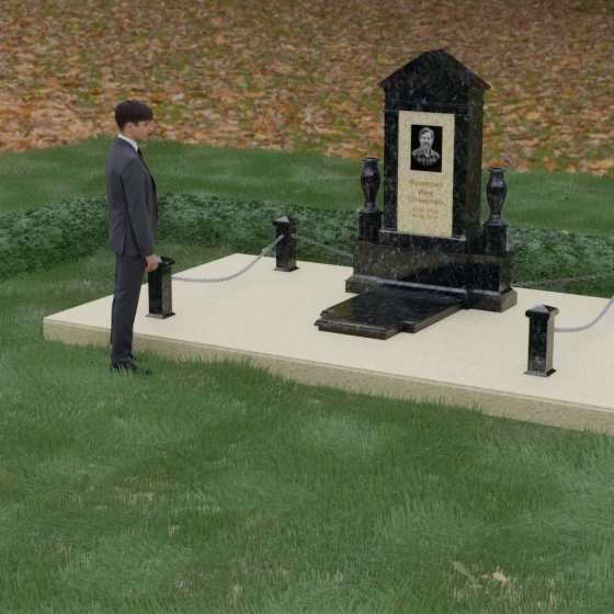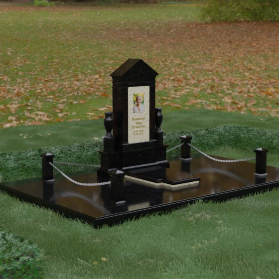 Сложная геометрия изделия подчеркивается безупречной зеркальной полировкой, в которой отражается мир, создавая ощущение глубины и пространства. Мемориальная композиция включает в себя не только основное изваяние, но и полностью благоустроенный участок. Основанием служит массивный гранитный цоколь, обеспечивающий вековую устойчивость всей конструкции. Вместо открытого грунта используется сплошная надгробная плита с идеальной фаской по периметру. Такая конфигурация не только придает захоронению завершенный, парадный вид, но и значительно упрощает уход за местом памяти, исключая появление сорняков и скопление влаги. Особое внимание уделено деталям: по углам участка установлены резные гранитные столбики с конусообразными вершинами, соединенные декоративными цепями. Этот элемент создает символическую границу, отделяющую зону вечного покоя.