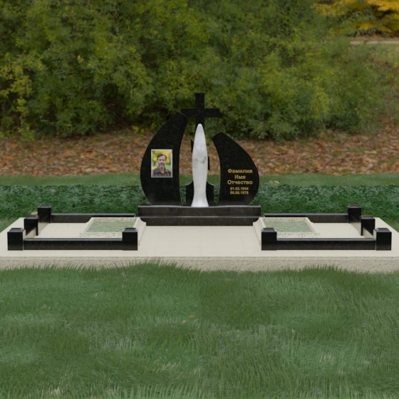 Особое внимание привлекает игра фактур: идеально гладкая, зеркальная полировка основных плоскостей камня соседствует с матовым, бархатистым исполнением центральной статуи. Такое сочетание позволяет свету играть на гранях мемориального комплекса, создавая глубокие тени и яркие блики, что придает всей конструкции дополнительный объем и монументальность. Это решение подчеркивает статусность мемориала и его эстетическое совершенство, делая его доминантой на месте захоронения.