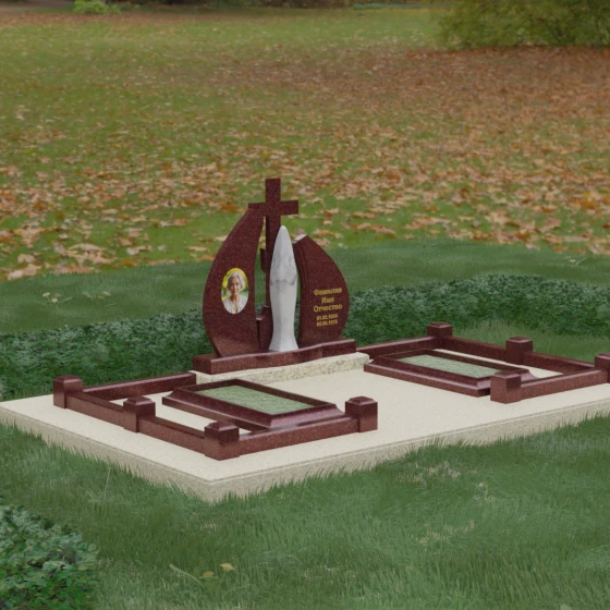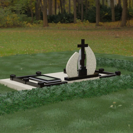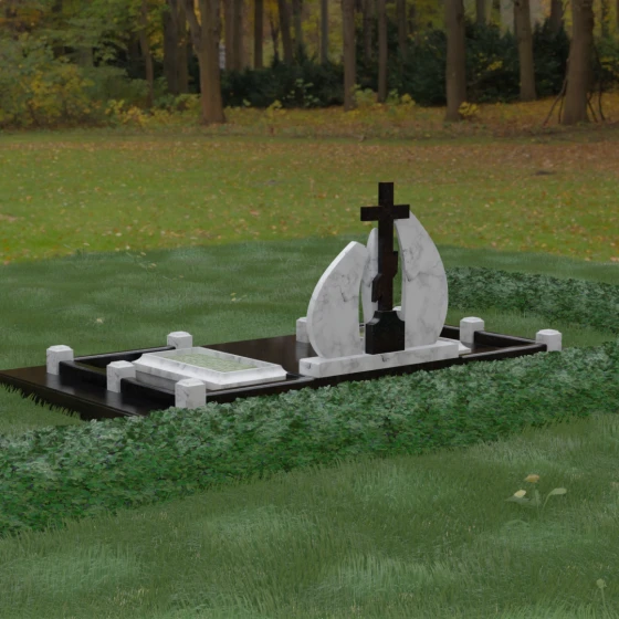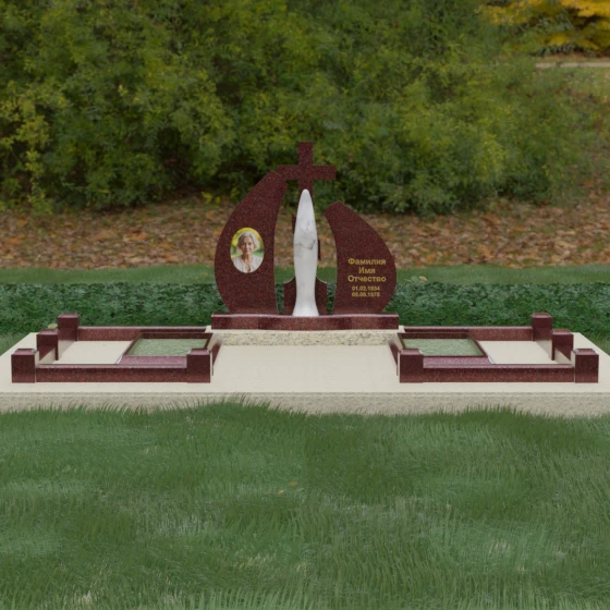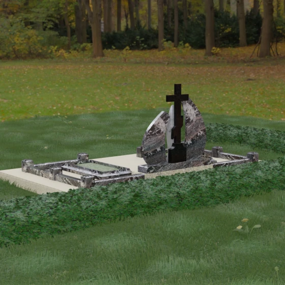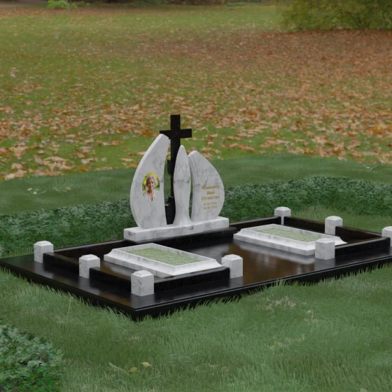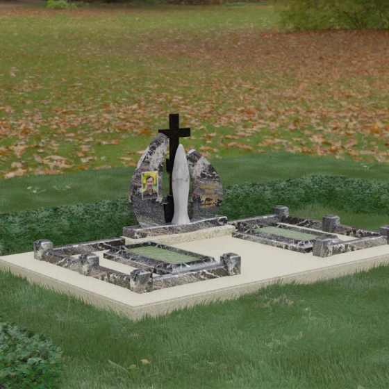 Внутри периметра предусмотрены два симметричных открытых цветника, которые позволяют внести живые краски в строгую геометрию камня. Конструкция стелы идеально сбалансирована для размещения парных портретов или надписей. Левое «крыло» традиционно отводится под гравировку портрета, где на темном полированном фоне изображение будет выглядеть максимально четким и контрастным. Правая часть предназначена для эпитафии и имен, нанесенных глубокой гравировкой с возможным золочением букв. Весь ансамбль продуман так, чтобы передать теплоту ваших чувств и сохранить память о дорогих людях в самом достойном виде.