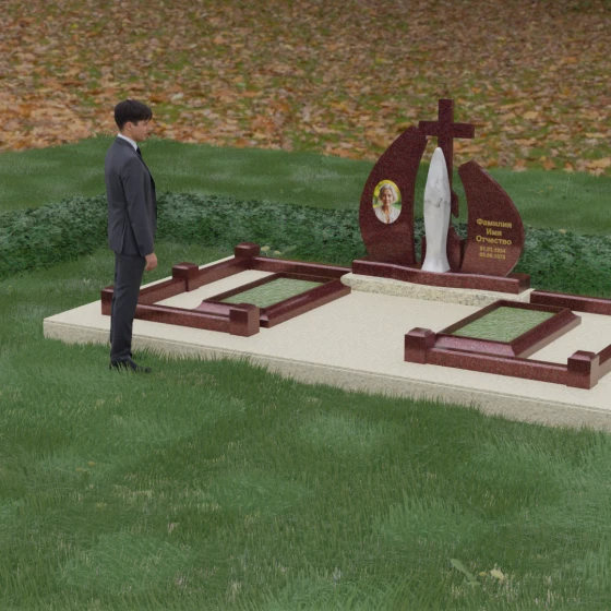Эта величественная стела представляет собой не просто мемориальный знак, а глубоко продуманную художественную композицию, в которой каждая линия наполнена смыслом. Центральным элементом мемориала является изящная скульптура Скорбящей матери, выполненная в мягком белом цвете. Её плавный силуэт, напоминающий застывшую молитву, контрастирует со строгим и лаконичным православным крестом, венчающим композицию. Форма боковых элементов стелы напоминает два крыла или два лепестка пламени, которые бережно обрамляют центральную фигуру, создавая ощущение защиты и вечного покоя.
