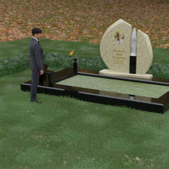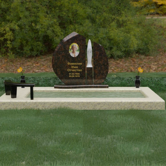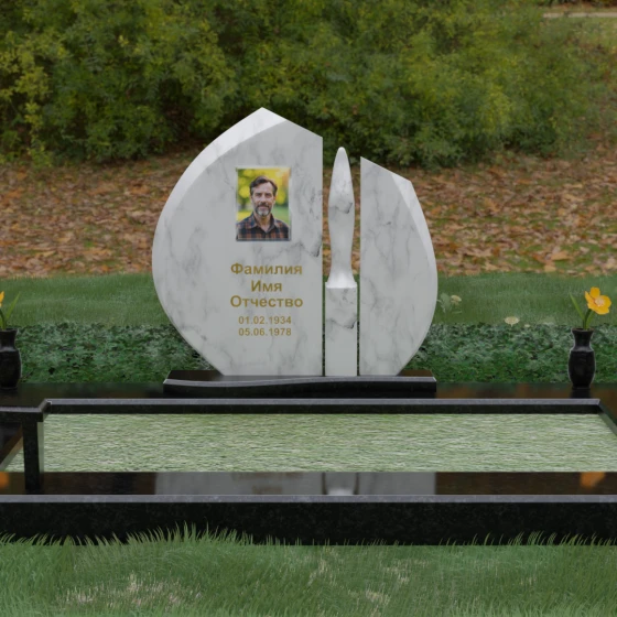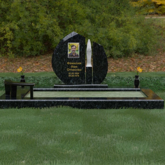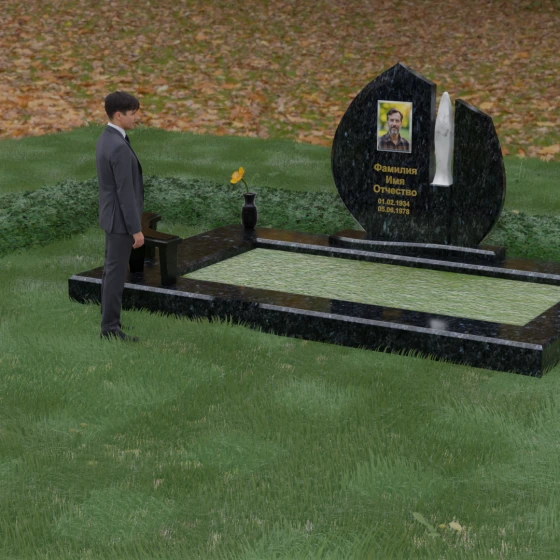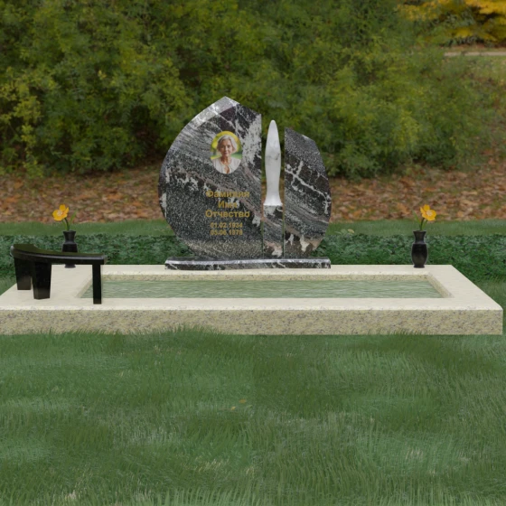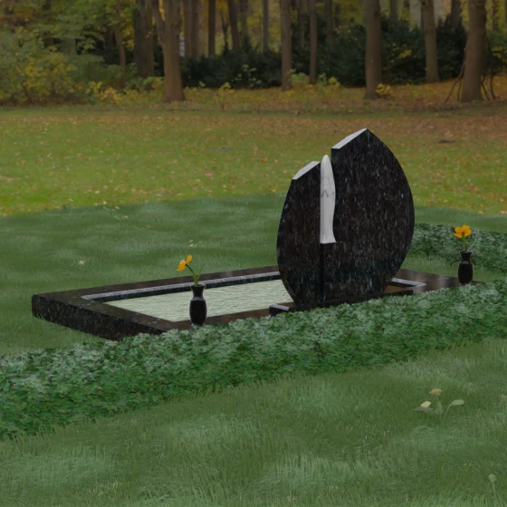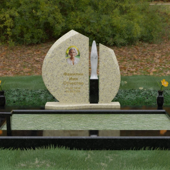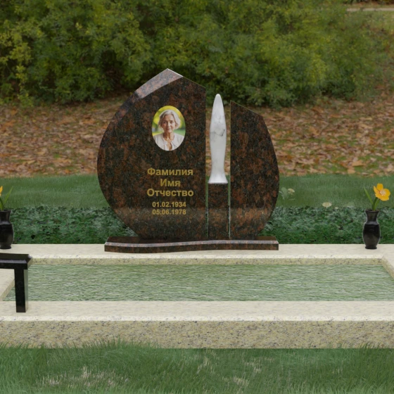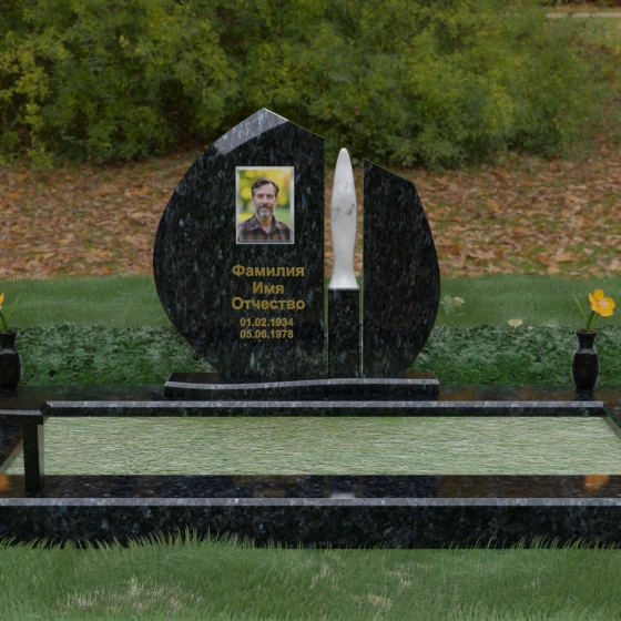 Центральное место в композиции занимает асимметричная стела, состоящая из двух контрастных по форме и цвету частей. Основной элемент выполнен в виде плавного полукруга с заостренной, напоминающей лепесток или пламя свечи, вершиной. Тщательно проработанные грани стелы имеют идеальную зеркальную полировку, в которой отражается окружающий мир, символизируя чистоту помыслов. Особое внимание привлекает центральный декоративный элемент — вертикальная вставка из белоснежного камня, выполненная в форме вытянутой капли или небесного огня. Эта деталь создает эффектный визуальный контраст с темным гранитом, разделяя композицию на «земную» и «небесную» составляющие.