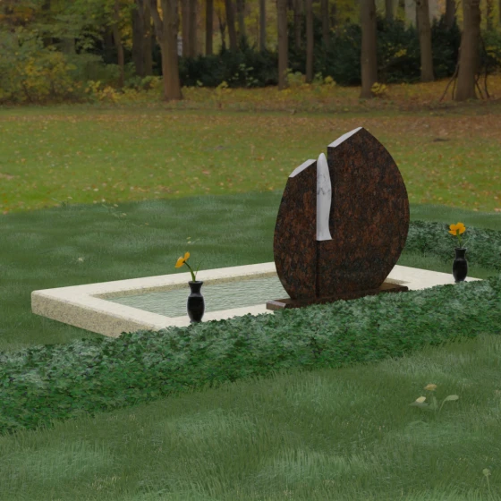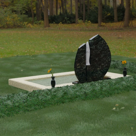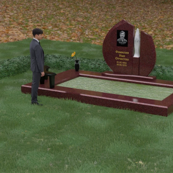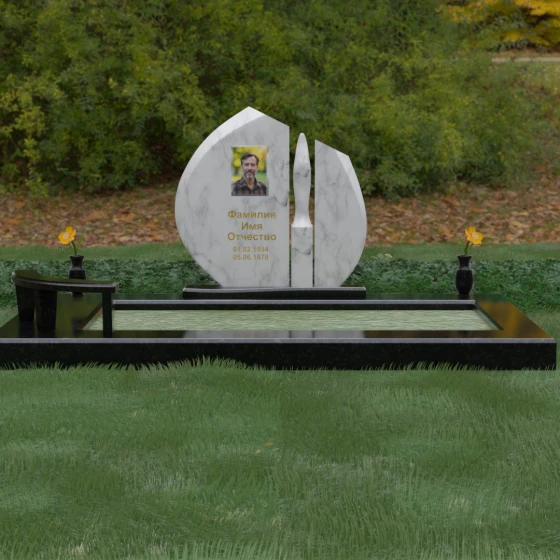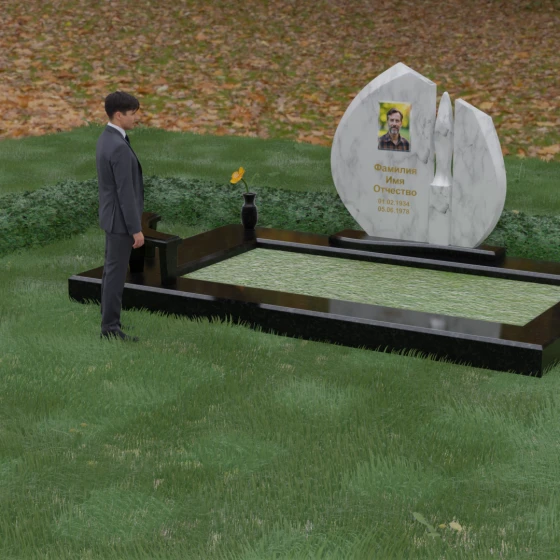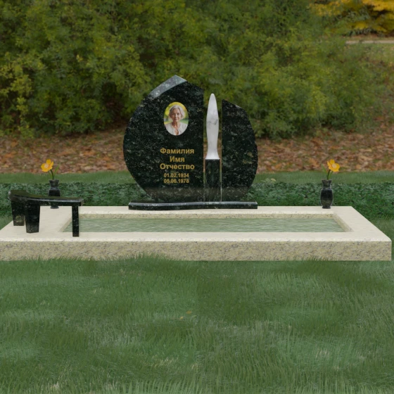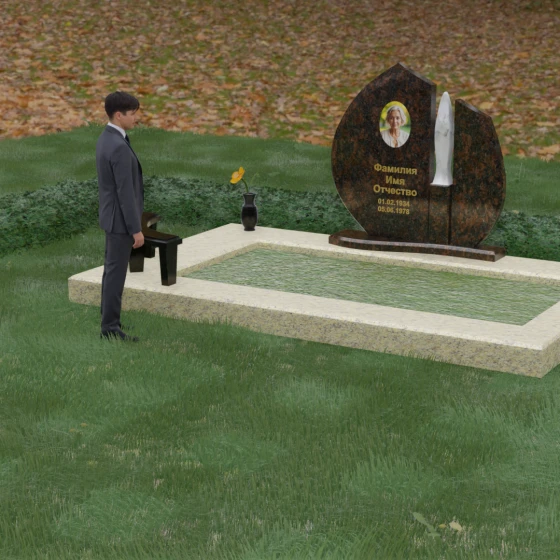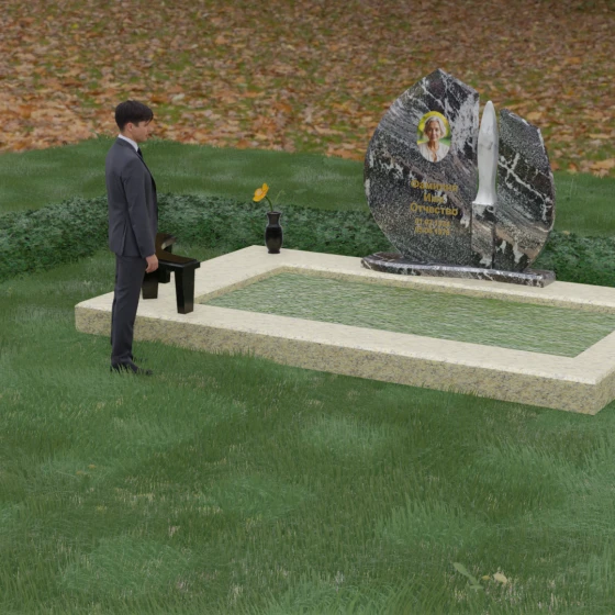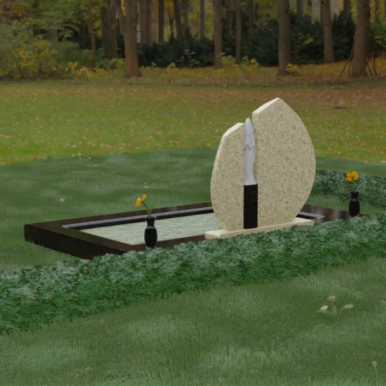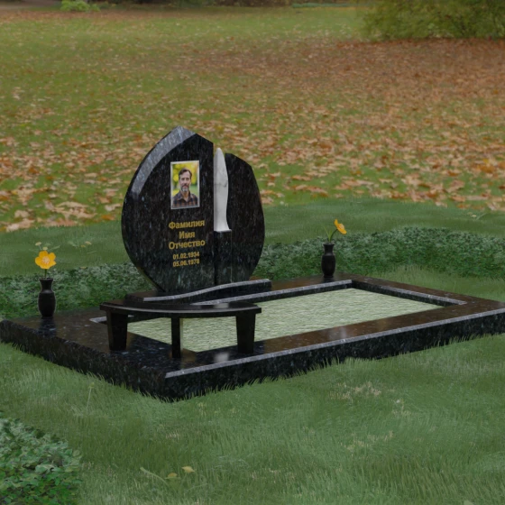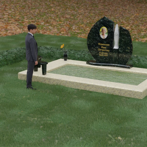 Центральное место в композиции занимает асимметричная стела, состоящая из двух контрастных по форме и цвету частей. Основной элемент выполнен в виде плавного полукруга с заостренной, напоминающей лепесток или пламя свечи, вершиной. Тщательно проработанные грани стелы имеют идеальную зеркальную полировку, в которой отражается окружающий мир, символизируя чистоту помыслов. Особое внимание привлекает центральный декоративный элемент — вертикальная вставка из белоснежного камня, выполненная в форме вытянутой капли или небесного огня. Эта деталь создает эффектный визуальный контраст с темным гранитом, разделяя композицию на «земную» и «небесную» составляющие.