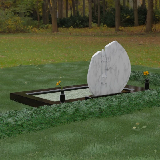 Форма разомкнутого круга в данном проекте глубоко символична: она олицетворяет бесконечность бытия и одновременно напоминает о том, что земной путь имеет свой финал, переходящий в иную форму существования. Белая центральная фигура, устремленная ввысь, ассоциируется с чистой душой, восходящей к свету. Плавные изгибы камня лишены агрессивных углов, что дарит ощущение покоя, защиты и умиротворения. Такое сочетание форм говорит о мягкости характера, нежности и той внутренней гармонии, которую сохранила память о человеке.