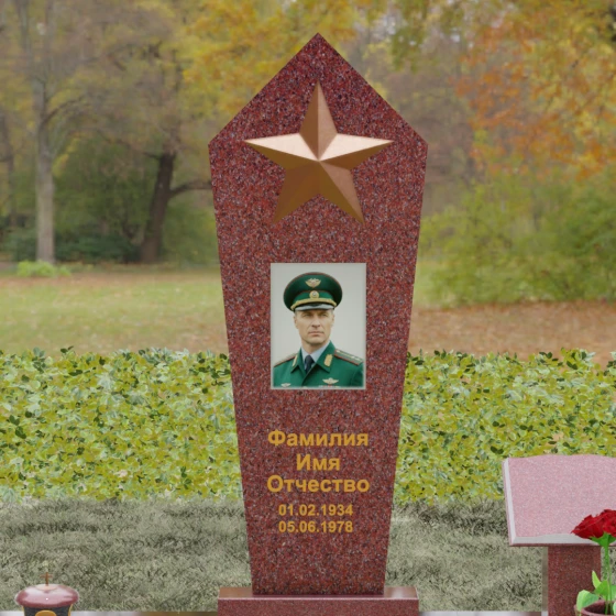 В верхней части стелы расположена объемная пятиконечная звезда, выполненная в технике накладного рельефа. Она является главным смысловым акцентом, контрастируя по цвету и фактуре с зеркальной поверхностью основного камня. Ниже расположен прямоугольный портрет на керамической основе, интегрированный в плоскость стелы с безупречной точностью. Завершает художественный образ гравировка текста, выполненная глубоким шрифтом с золочением, что обеспечивает читаемость надписей на десятилетия вперед.