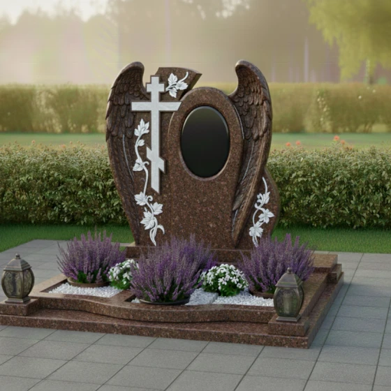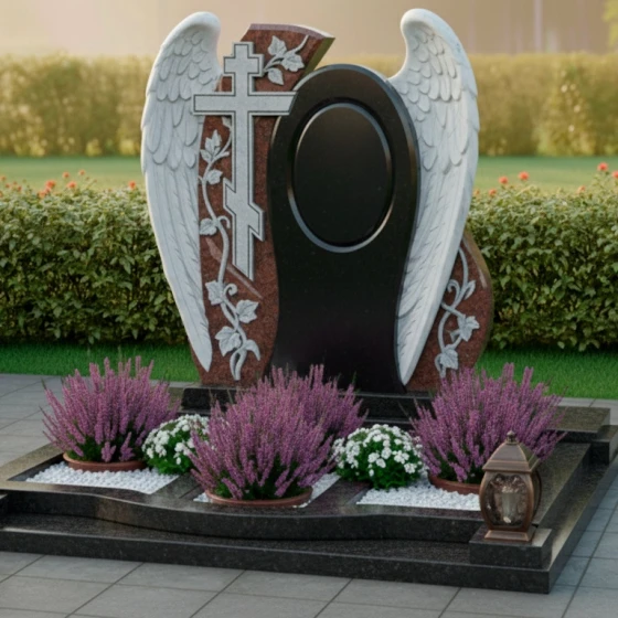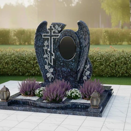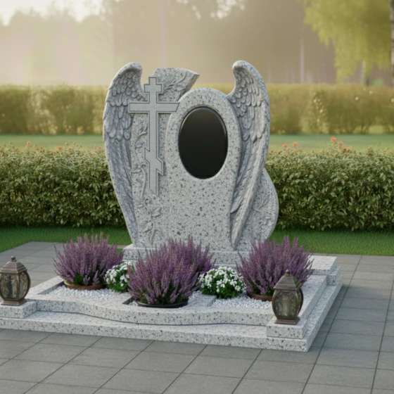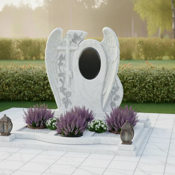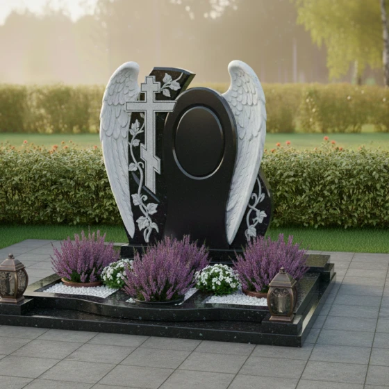 С обеих сторон стелы, словно обнимая ее, распахнуты белоснежные крылья ангела. Их перья, вырезанные с невероятной точностью, создают ощущение воздушности и легкости, несмотря на массивность камня. Контраст между темной, глубоко полированной поверхностью основного гранита и светлой, матовой фактурой крыльев рождает удивительную игру света и тени, придавая композиции динамизм и эмоциональную глубину. Это не просто декоративный элемент, а мощный символ защиты, утешения и вознесения души. Изящные, тонкие прожилки на каждом пере, легкая шероховатость их поверхности подчеркивают ручную работу и внимание к деталям, которые отличают настоящий шедевр.