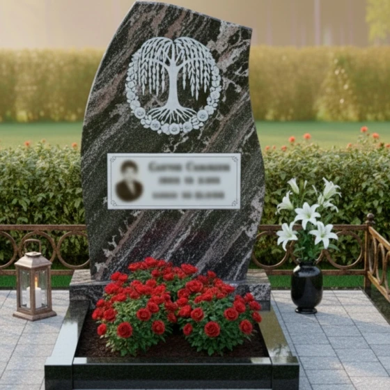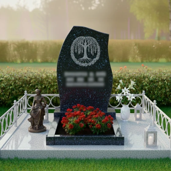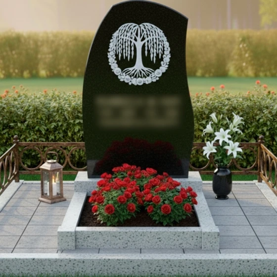 Центральный элемент композиции — это искусно выгравированное «Древо жизни», заключенное в круг из нежных роз. Каждая ветвь древа, каждая роза проработана с невероятной детализацией, создавая объемный и живой образ на идеально отполированной поверхности черного камня. Контраст между зеркальной гладью гранита и светлой, матовой фактурой резьбы придает изображению особую выразительность и глубину. Древо жизни символизирует цикличность бытия, связь поколений и неувядающую память, а розы — любовь, красоту и скорбь.