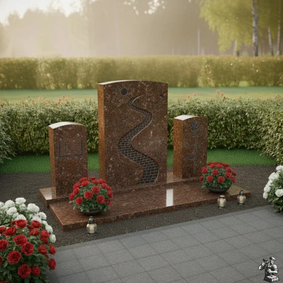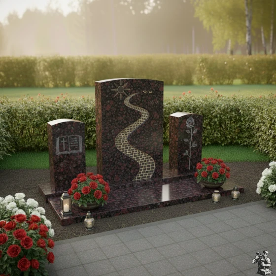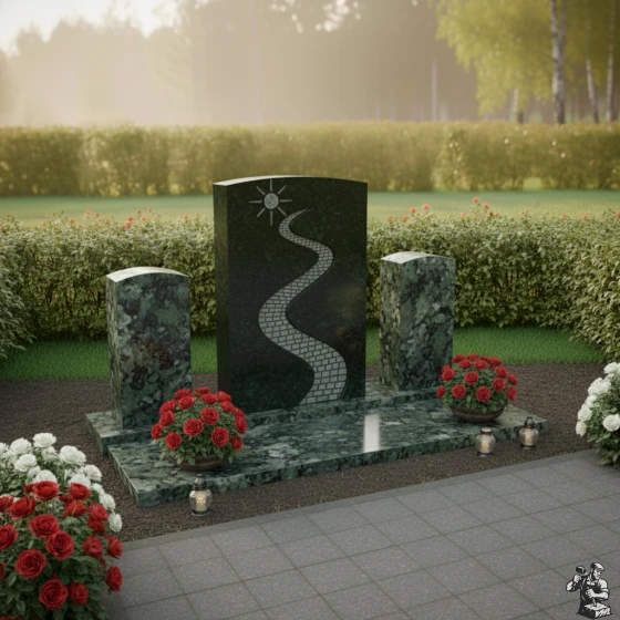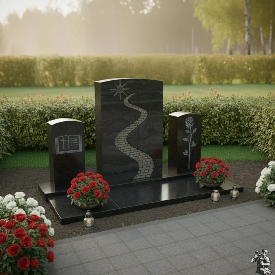 Величественная стела, центральный элемент композиции, представляет собой мощный вертикальный прямоугольник с мягко скругленными верхними углами, что придает ей одновременно строгость и деликатность. Её грани тщательно отполированы до зеркального блеска, отражая свет и создавая ощущение глубины. На лицевой стороне стелы выгравирован извилистый путь, символизирующий жизненный путь усопшего. Этот путь, выложенный брусчаткой, ведет вверх к сияющему солнцу, которое, подобно путеводной звезде, освещает каждый шаг. Игра фактур здесь особенно выразительна: зеркальный черный гранит стелы контрастирует с матовой, чуть шероховатой поверхностью выгравированного пути и солнца, создавая эффект объема и осязаемости. Эта художественная деталь придает стеле особую индивидуальность и глубину, приглашая к размышлениям о смысле бытия.