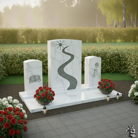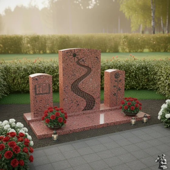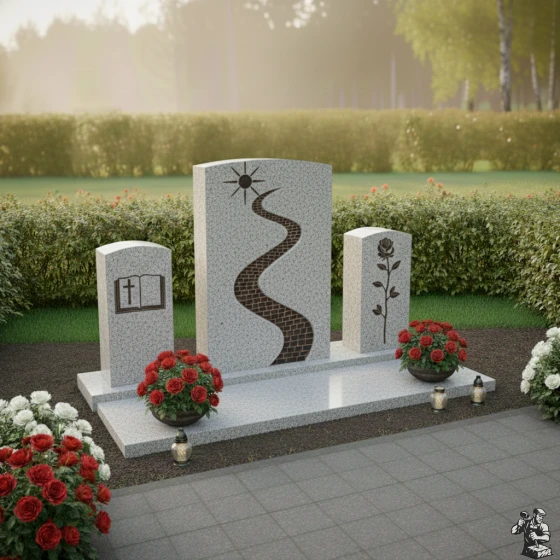 По обе стороны от главной стелы расположены две меньшие вертикальные плиты, выполненные в едином стиле. Левая плита, также с мягко скругленным верхом, украшена гравировкой раскрытой книги — символа мудрости, знаний и вечной памяти. Страницы книги кажутся реальными, а буквы на них — живыми, что подчеркивает значимость наследия, оставленного человеком. Правая плита, идентичная по форме, несет на себе изображение изящной розы с распустившимися лепестками и стеблем. Роза, как древний символ любви, красоты и скоротечности жизни, здесь выполнена с удивительной детализацией, каждый лепесток и шип проработан, создавая впечатление легкого движения. Эти боковые элементы не просто дополняют центральную стелу, но и расширяют её смысловое поле, создавая гармоничное трио, в котором каждый символ находит своё место.