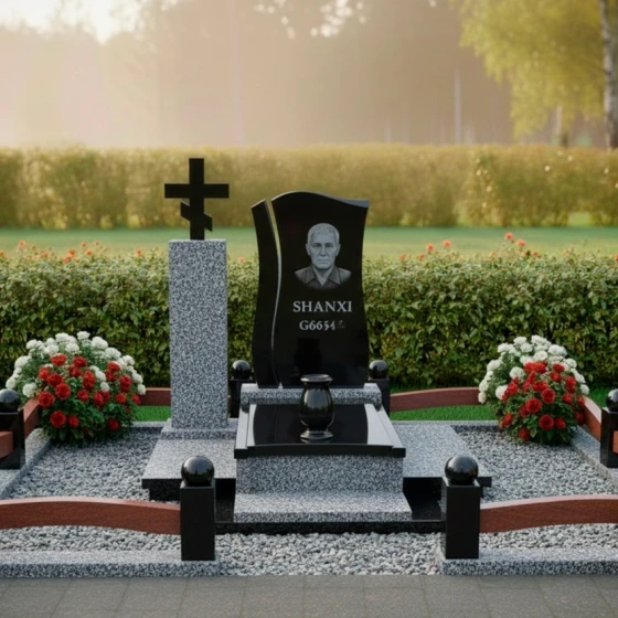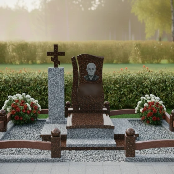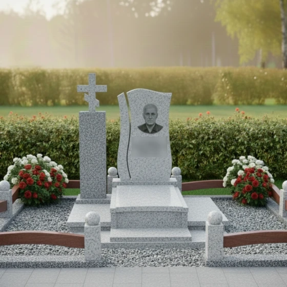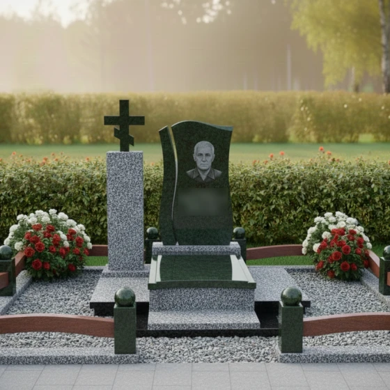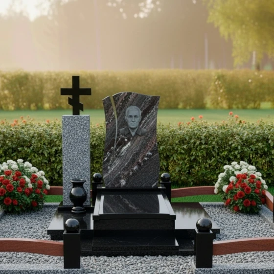 Благоустройство участка вокруг монумента выполнено с такой же тщательностью и вниманием к деталям. Основание монумента покоится на прочном и эстетичном цоколе из светлого гранита, который создает необходимую высоту и массивность, обеспечивая устойчивость всей конструкции. Этот цоколь, с его мелкозернистой фактурой, служит контрастным фоном для центрального черного элемента, визуально выделяя его. Пространство внутри цоколя заполнено декоративной гранитной крошкой, которая не только придает участку ухоженный и завершенный вид, но и значительно упрощает уход за местом захоронения, избавляя от необходимости регулярной прополки. Надгробная плита, расположенная непосредственно перед центральной частью, также выполнена из черного полированного гранита, гармонично продолжая тему элегантности и строгости. На ней установлена изящная каменная ваза, идеально вписывающаяся в общую композицию и предназначенная для живых цветов, которые принесут тепло и свежесть в это место памяти. По углам участка, за пределами основного цоколя, расположены клумбы с пышными кустами роз, красные и белые бутоны которых символизируют любовь и чистоту, добавляя яркие акценты и оживляя пространство. Эти клумбы обрамлены низким декоративным бордюром из темного камня, а по периметру участка проходит элегантная ограда, состоящая из полированных черных столбиков и плавных деревянных или металлических перекладин, которые придают благоустройству завершенный и гармоничный вид. Вся композиция демонстрирует глубокое уважение к памяти и стремление создать место, где можно спокойно предаться воспоминаниям.
