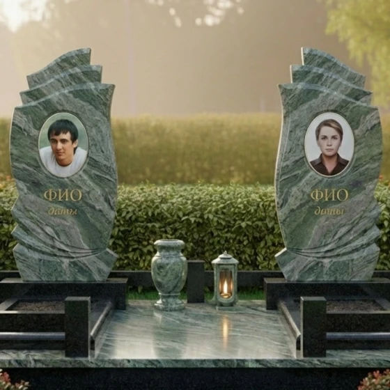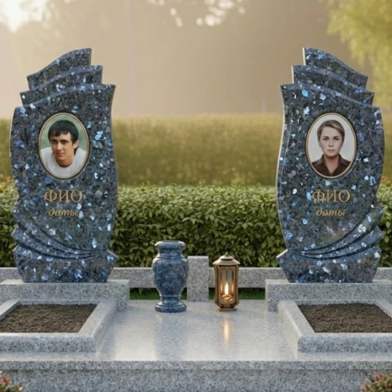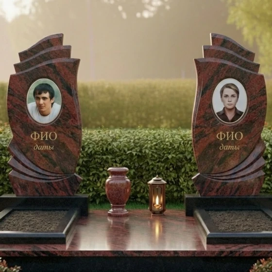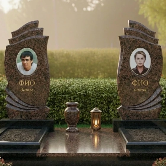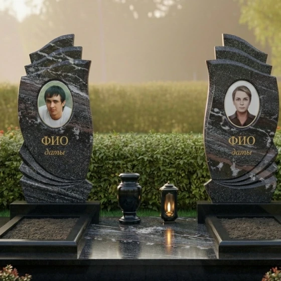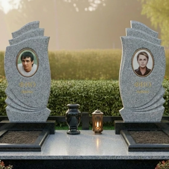 Благоустройство участка довершает общую композицию, придавая ей законченный и ухоженный вид. Высокий гранитный цоколь, обрамляющий периметр захоронения, обеспечивает не только прочность и устойчивость всей конструкции, но и придает ей весомость и монументальность. Надгробная плита, выполненная в едином стиле со стелой, полностью закрывает участок, что значительно упрощает уход за местом упокоения и создает ощущение чистоты и порядка. В центре композиции, между двумя стелами, расположены изящная каменная ваза и лампадка, выполненные из того же благородного камня. Эти элементы не только гармонично вписываются в общую концепцию, но и служат символами вечного огня памяти и живых цветов, которые всегда будут украшать это священное место.