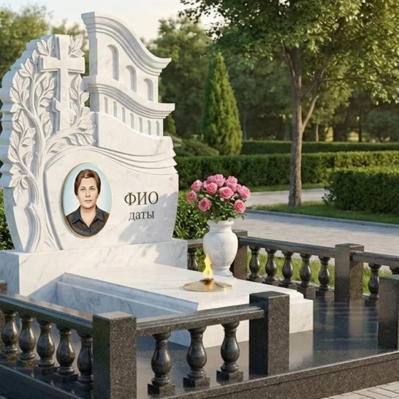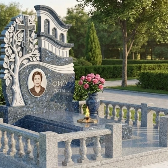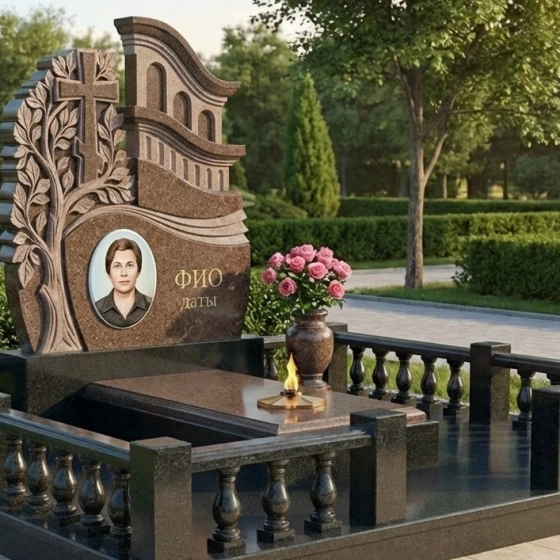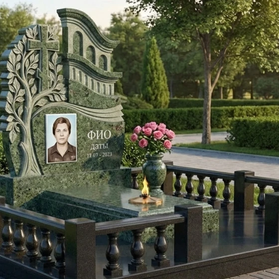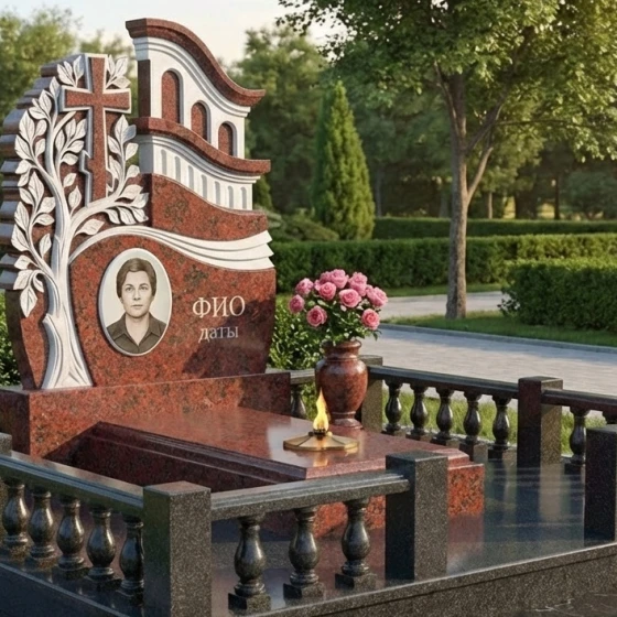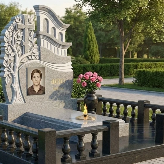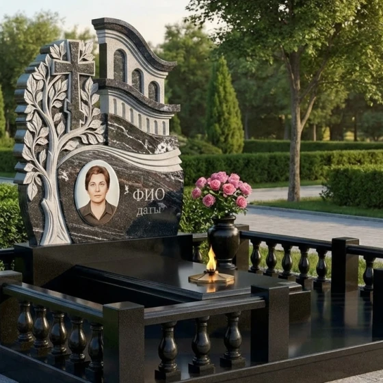 Центральный элемент, вертикальная плита, выполнен в асимметричном дизайне, где правая часть возвышается строгой, но в то же время изящной аркой, напоминающей очертания храма или часовни, что придает монументу сакральное значение. Левая же сторона представляет собой живописное полотно из камня. Здесь, словно оживая, раскинулось могучее дерево с пышной кроной, его резные листья и ветви тянутся вверх, символизируя непрерывность жизни и духовное возрождение. Детализация резьбы поражает воображение: каждый листок, каждая веточка выполнены с поразительной точностью, создавая объем и игру света на матовой поверхности камня, контрастирующей с глубокой, зеркальной полировкой основной плоскости.
