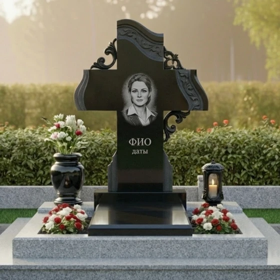 Особое внимание привлекает виртуозная резьба, украшающая основание креста и боковые элементы. Здесь мы видим объемные, словно живые, цветы — розы с их нежными, раскрывающимися лепестками, выполненные с удивительной точностью. Каждый лепесток, каждая прожилка кажется осязаемой благодаря контрасту между глубокой черной полировкой основной поверхности и светлым, матовым срезом камня, который подчеркивает каждую грань резного элемента. Эта игра фактур создает эффект глубины и реализма, превращая камень в нечто большее, чем просто материал. Нижняя часть памятной плиты имеет строгую прямоугольную форму, что создает устойчивый фундамент для всей композиции. На ней предусмотрено идеальное место для гравировки портрета, который, благодаря зеркальной полировке, будет выглядеть особенно выразительно, словно глядя из вечности. Под портретом гармонично располагаются строки для имени и дат, выполненные в классическом стиле.