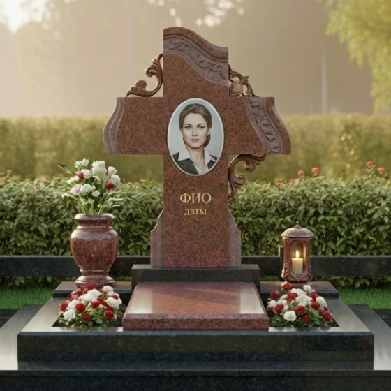 Представляем вашему вниманию гранитный монумент, артикул ПН 441, который является не просто надгробным сооружением, а подлинным произведением мемориального искусства. Эта композиция, выполненная с глубоким вниманием к деталям и символизму, призвана увековечить память о близком человеке, сочетая в себе строгость форм и изящество художественной резьбы. Центральный элемент — вертикальная памятная плита, вершина которой искусно оформлена в виде православного креста с распятием. Это не просто крест, а сложная, многослойная форма, где полированные грани чередуются с матовыми, создавая игру света и тени, подчеркивающую глубину и объем. Распятие выполнено с особой деликатностью, его рельеф мягко выделяется на фоне зеркальной поверхности, притягивая взгляд и вызывая чувство умиротворения. Боковые части навершия плавно изогнуты, образуя подобие драпировки, что придает монументу ощущение движения и легкости, несмотря на массивность камня.