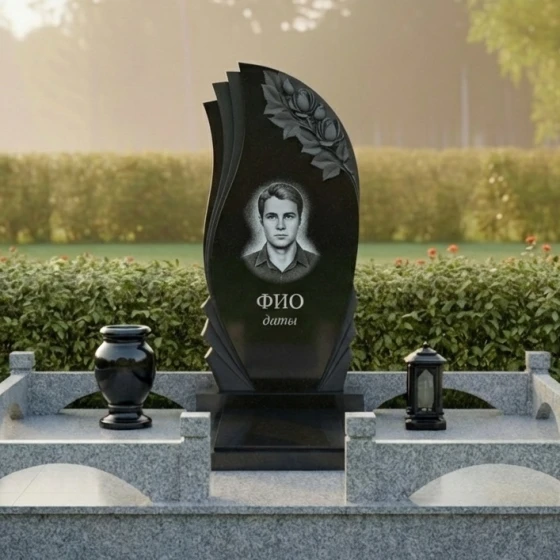 Грани монумента обработаны с особой тщательностью. Боковые поверхности надгробия имеют плавные, округлые фаски, которые смягчают строгие линии и придают изделию законченный, благородный вид. Нижняя часть надгробия, где располагается портрет и данные усопшего, имеет строгие, но при этом гармоничные пропорции, создавая прочную основу для всей композиции. Зеркальная полировка черного гранита отражает свет, создавая игру бликов и теней, что придает монументу особую глубину и выразительность.