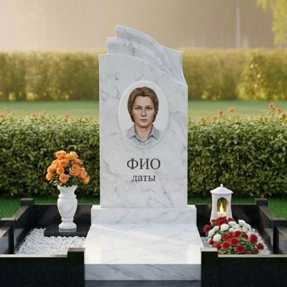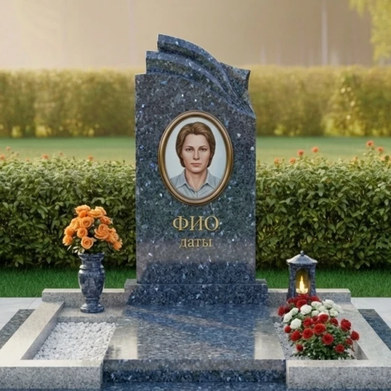 Оформление: Для данной формы стелы мы рекомендуем гравировку портрета в овальной или прямоугольной рамке, расположенной в верхней части. Это позволит сохранить центральную композицию и не перегрузить пространство. ФИО и даты жизни лучше разместить под портретом, используя классический шрифт, который будет хорошо читаться на полированной поверхности камня. Возможно также добавление небольшого эпитафийного текста или символического изображения (например, голубя или ветви), которые подчеркнут индивидуальность усопшего и усилят эмоциональное воздействие ритуального изделия.