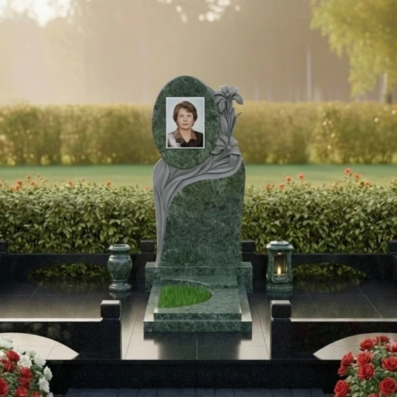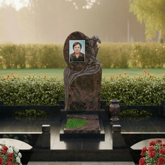 Величественная стела данного ансамбля притягивает взгляд своей сложной, асимметричной геометрией. В верхней части композиции доминирует идеально выверенный овал, предназначенный для размещения портрета, который словно обрамлен самим камнем. Особого внимания заслуживает художественная резьба: по правому краю мемориала ниспадает пышное соцветие лилий. Мастер-камнерез детально проработал каждый лепесток, создавая объемный барельеф, который кажется живым благодаря игре света. Лилии символизируют чистоту и вечный покой, а их плавные изгибы плавно перетекают в волнообразные линии, окаймляющие нижнюю часть плиты.