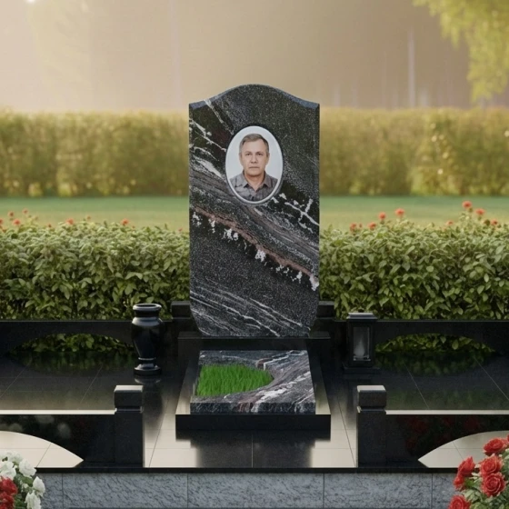 Индивидуальность мемориала подчеркивается широкой палитрой материалов. Данная модель доступна в 8 уникальных цветовых решениях. Вы можете выбрать глубокий антрацит гранита Габбро-диабаз, благородный лесной оттенок Балтик грин, искрящийся Блю Перл или огненно-красный Лезниковский гранит. Также доступны варианты из пестрого Амфиболита, насыщенного Дымовского, светлого Мансуровского гранита или белоснежного мрамора Тассо. Такое разнообразие позволяет подобрать камень, который наиболее точно отразит характер и жизненный путь близкого человека.