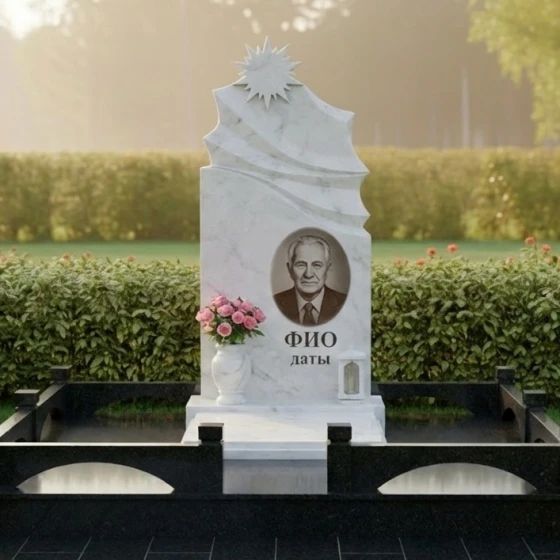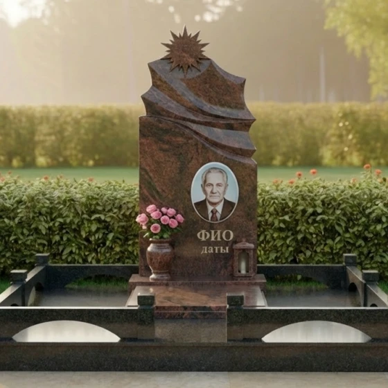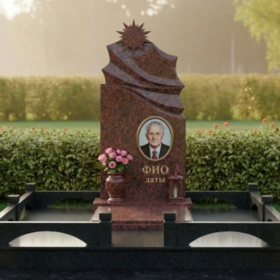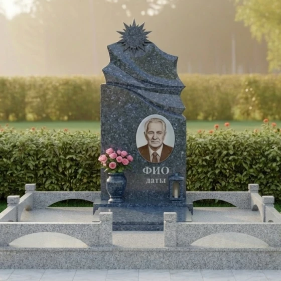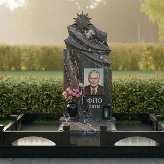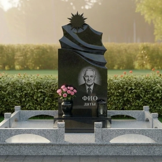 Особое внимание привлекает верхний элемент — лучезарная звезда, венчающая композицию. Ее остроконечные лучи, выполненные в контрасте с общей полировкой, выглядят объемно и торжественно, символизируя светлую память, которая будет вечно сиять. Звезда несет в себе глубокий смысл, олицетворяя путеводный свет, надежду и вечность души. Поверхность стелы, где нанесен портрет и данные, имеет глубокую, зеркальную полировку, что позволяет камню отражать окружающий свет и небо, делая изображение ушедшего еще более выразительным и живым. Каждая грань, каждый изгиб камня обработан с ювелирной точностью, подчеркивая мастерство создателей и достоинство памяти.