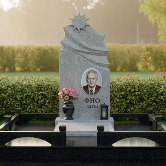 Композиция дополнена изящной каменной вазой для цветов, расположенной у основания стелы. Ее классическая форма и гладкая полировка прекрасно гармонируют с общим стилем, предоставляя место для живых цветов, что является важным элементом выражения скорби и любви. Рядом с вазой находится лаконичная каменная лампадка, которая символизирует негасимый свет памяти и присутствие души, создавая умиротворенную и трогательную атмосферу. Все элементы благоустройства выполнены из того же прочного и долговечного камня, что и центральная стела, что гарантирует их стойкость к внешним воздействиям и сохранение первозданного вида на долгие годы.