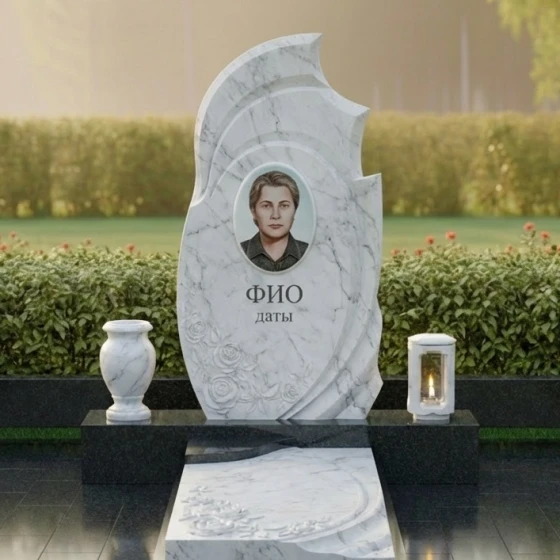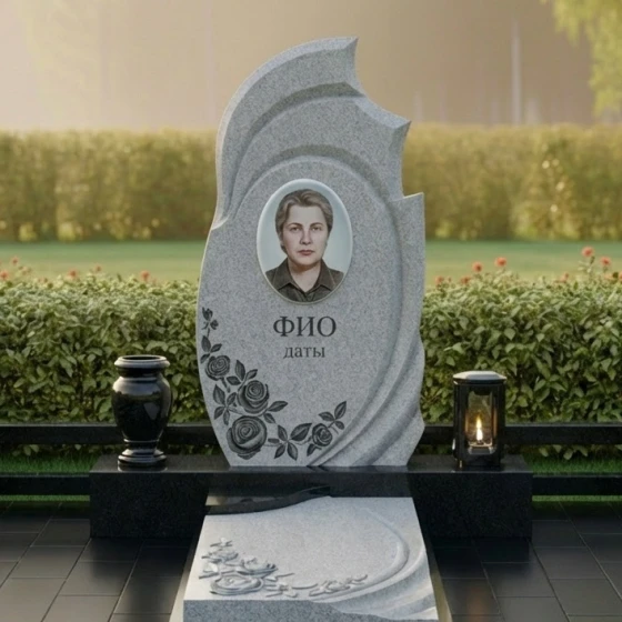 Стела этого ритуального изделия обладает уникальной, запоминающейся формой, которая сразу привлекает внимание своей выразительностью. Верхняя часть стелы асимметрична, с одной стороны она плавно изогнута, напоминая мягкую волну или развевающееся знамя, символизирующее вечность и движение жизни, а с другой — имеет более резкий, но гармоничный изгиб, создающий ощущение динамики и глубины. Центральная часть стелы плавно сужается кверху, а затем вновь расширяется, образуя изящную нишу для портрета усопшего. Эта ниша имеет овальную форму, деликатно обрамляя изображение и придавая ему особую значимость. Грани стелы тщательно обработаны, демонстрируя мастерство резчиков, которые добились идеальной гладкости и четкости линий.