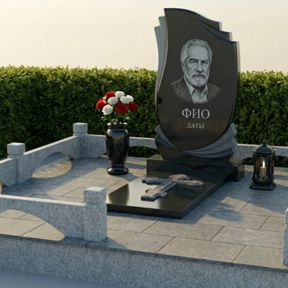 Оформление: Для стелы такой изысканной формы идеально подходит гравировка портрета, выполненная в технике художественной ретуши, чтобы подчеркнуть каждую черту лица. Портрет, расположенный в центральной части "свитка", будет выглядеть особенно выразительно благодаря игре света и тени на полированной поверхности. Фамилия, имя и отчество, а также даты жизни, выгравированные строгим, но элегантным шрифтом, органично впишутся в общий дизайн, располагаясь под портретом и подчеркивая его значимость.