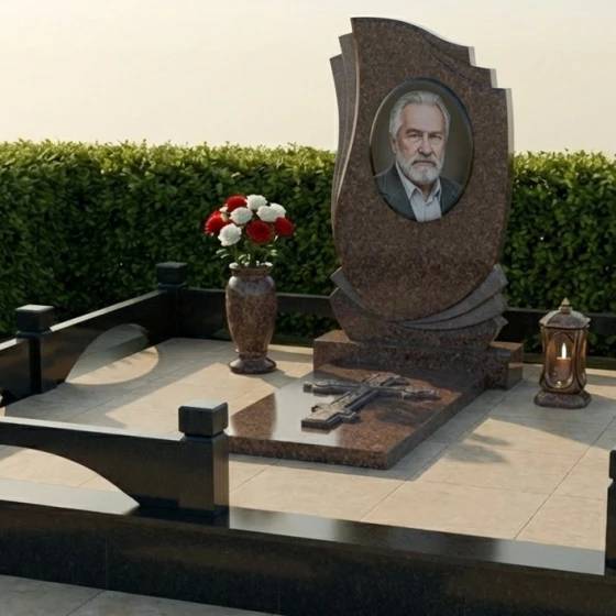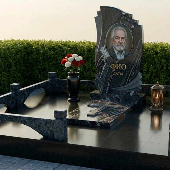 Особое внимание привлекает игра контрастов: идеально отполированная до зеркального блеска черная поверхность стелы, на которой выгравирован портрет, резко контрастирует с матовыми, шероховатыми гранями резных элементов. Это создает не только визуальный объем, но и тактильное ощущение глубины, подчеркивая мастерство обработки камня. В нижней части стелы, словно обнимая ее основание, расположена изящная драпировка, выполненная в технике объемной резьбы. Ее мягкие, струящиеся складки добавляют композиции легкости и символизируют покров, окутывающий вечный покой. Эта драпировка, кажется, высечена из света и тени, каждая ее складка играет оттенками, создавая иллюзию движения.