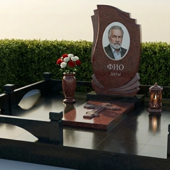 Надгробная плита, выполненная из того же черного, зеркально полированного гранита, что и стела, создает законченный и ухоженный вид всему участку, значительно упрощая уход за ним. В центре плиты, словно оберегая покой, покоится объемный православный крест, выполненный в технике барельефа. Его грани также отполированы, что позволяет свету играть на них, создавая эффект свечения. Рядом с крестом, в нише, находится изящная черная ваза с букетом алых и белых роз — символов любви и чистоты, а также элегантная лампадка, готовая зажечь огонь вечной памяти. Эти детали не просто украшают, но и наполняют композицию глубоким смыслом.